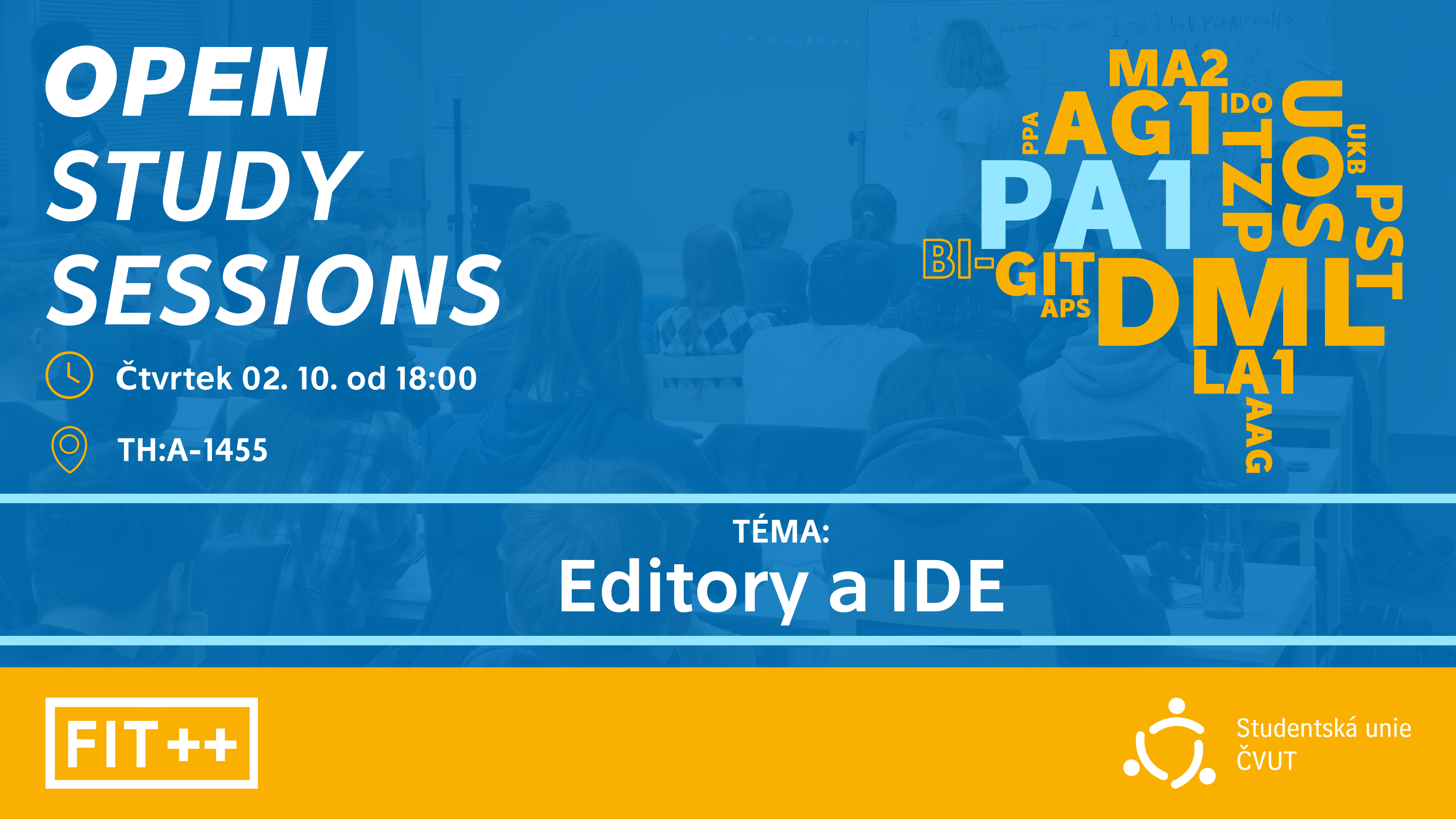 Začínáš na FIT a tápeš, jaký editor nebo IDE si vybrat? Ve čtvrtek pořádáme OpenStudySession právě pro tebe! Ukážeme ti rozdíl mezi editory a IDE, jejich hlavní výhody a nevýhody a představíme oblíbené nástroje, jako jsou VSCode, CLion, Vim nebo třeba Nano na BI-UOS. Dozvíš se také, jak spouštět první testy, kompilovat na Linuxu i Windows a jak ti můžou pomoct pluginy. Po akci se samozřejmě budeš moct na cokoliv zeptat a my ti rádi poradíme.